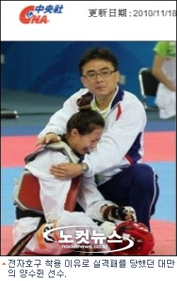 이에 앞서 지난 17일 광저우아시안게임 태권도 여자 49kg급 금메달 후보였던 대만 양수쥔은 1회전에서 베트남 선수에 9:0으로 앞서고도 경기종료 12초 전 규정에 어긋나는 전자호구를 착용했다는 이유로 실격패를 당했다.