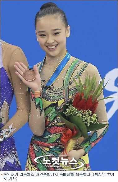 26일 광저우 아시안게임타운 체육관에서 열린 2010 광저우 아시안게임 리듬체조 개인종합 결승에서 동메달을 따낸 손연재는 연신 웃어 보였다. 자신의 첫 메달이자 한국의 아시안게임 사상 첫 개인종합 메달을 따낸 스스로가 대견스러운 듯 했다.