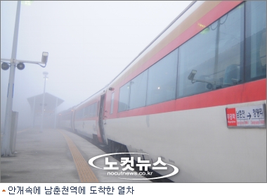 안개가 자욱한 남춘천역사 철로 위로 무궁화호 열차가 들어오고 있다.