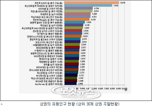 유동인구 기준으로 부산지역 최고의 상권은 북구의 지하철 덕천역 주변인 것으로 나타났다.