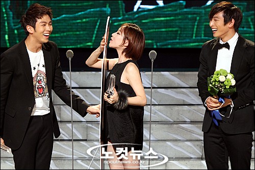 29일 저녁 경기도 일산 MBC 드림센터에서 열린 ''2010 MBC 방송연예대상'' 시상식에 베스트 커플상을 조권과 가인이 수상한 가운데 개인일정으로 참석하지 못한 조권을 대신한 실사 사진에 가인이 키스를 하고 있다.