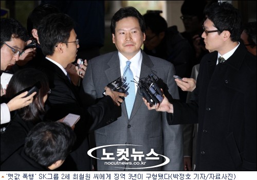 SK그룹 2세인 최씨는 지난해 10월 한남동 자신의 사무실에서 맷값이라며 2000만원을 주고 고용승계 등을 요구하는 지입차량 차주 유모씨를 야구방망이와 주먹으로 마구 때린 혐의 등으로 구속기소됐다.