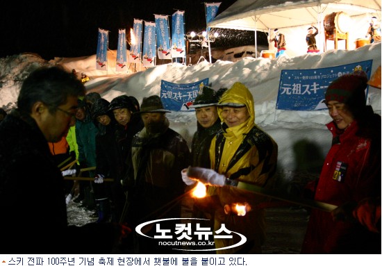 우리가 방문했던 1월 15일은 스키 전파 100주년 기념 축제가 열리던 날이었다. 아카쿠라관광리조트 스키장 아래 광장에 무대를 설치하고 니이가타시 부지사를 비롯해 외국의 스키관광객들이 참석한 가운데 기념식을 진행했다. 굵은 눈발이 하염없이 내리는 가운데,북소리와 고수들의 춤이 어우러지며 분위기를 돋구었다.사케 술통을 나무망치로 깨뜨리는 의식으로 막을 열자,100주년을 기념하는 100개의 횃불에 점화를 한 뒤 이 횃불을 든 사람들이 달집 2개에 빙 둘러 서서 달집을 태움으로써 이곳 스키시즌의 성공을 기원했다.이어 불꽃축제가 열렸다. 그런데 이게 왠일인가. 포 쏘는 소리는 들리건만 화려한 불꽃은 보이지 않고,어렴풋이 그 흔적만 보일 뿐이다. 눈이 하늘을 뒤덮은 나머지 공중의 불꽃을 먹어버린 것이다. 희한한 체험이었다.