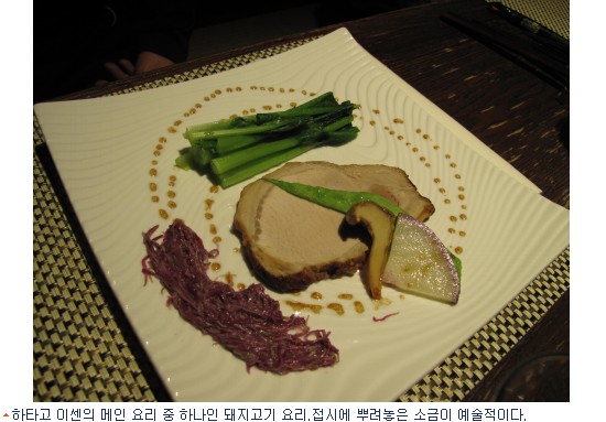 사케와 향토음식을 결합해 장사를 하는 곳도 눈길을 끌었다.하타고 이센이 그 곳이다.하타고는 료칸 이전의 옛 주막같은 시설인데, 하타고 이센은 현대식으로 부활시킨 것이다. 하타고 이센은 사케를 직접 제조하고, 여기에 맞는 안주요리를 개발했다. 사케는 1년산과 3년산이 있다. 1년산은 신선하고 향이 확 터지는 맛이며, 3년산은 부드러운 느낌을 준다. 사케 안주로는 메인요리로 돼지고기와 방어가 나온다. 느타리버섯과 메밀가루 튀김,당근 등이 곁들여진다. 접시에 뿌려놓아 음식을 찍어먹는 소금은 해초와 함께 건조시켜 독특한 맛을 낸다.