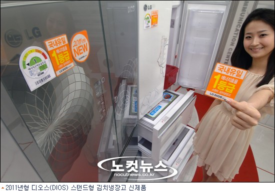 LG전자는 "높은 절전효과로 에너지 소비효율 1등급을 달성한 국내 최대 용량 405ℓ 제품 등 2011년형 디오스(DIOS) 스탠드형 김치냉장고 신제품 21종을 출시했다"고 27일 밝혔다.