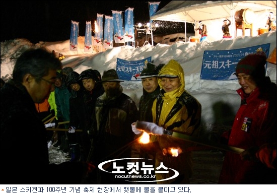 사케 술통을 나무망치로 깨뜨리는 의식으로 막을 열자,100주년을 기념하는 100개의 횃불에 점화를 한 뒤 이 횃불을 든 사람들이 달집 2개에 빙 둘러 서서 달집을 태움으로써 이곳 스키시즌의 성공을 기원했다. 이어 불꽃축제가 열렸다. 그런데 이게 왠일인가. 포 쏘는 소리는 들리건만 화려한 불꽃은 보이지 않고,어렴풋이 그 흔적만 보일 뿐이다. 눈이 하늘을 뒤덮은 나머지 공중의 불꽃을 먹어버린 것이다. 희한한 체험이었다.