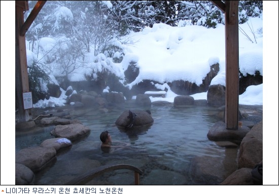 우리 일행이 묵은 곳은 료칸이 몰려 있는 무라스키 온천의 쵸세칸(長生館)이었다. 이른 아침에 일어나 이 곳의 야외온천을 즐겼다. 사방에는 가지마다 눈뭉치를 이고 있는 삼나무들이 둘러싼 가운데, 부드럽게 흘날리는 눈송이를 맞으며 대기의 차가움과 지하수의 뜨거움을 한 몸에서 느껴본다.