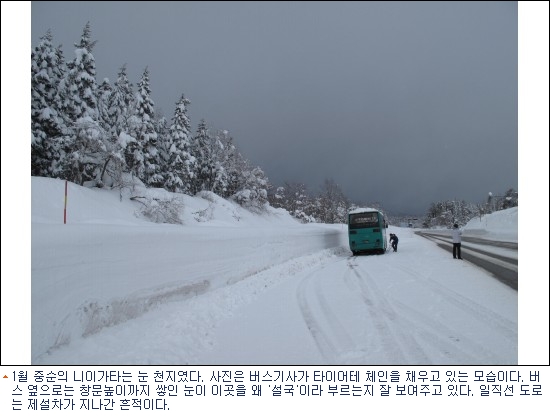 1월 중순 일본 서해안의 중심에 위치한 니이가타현(新潟縣)에 머무는 닷새동안 그곳은 온통 눈 천지였다. 니이가타 공항에 내린 첫날부터 종일 굵은 눈발이 흩날리고 도로주변은 2-3미터 높이의 눈이 쌓여 있었다. 키가 높은 삼나무엔 큰 솜뭉치같은 눈덩이들이 층층이 쌓여 있어 멋진 자태를 뽐내고 있었다.