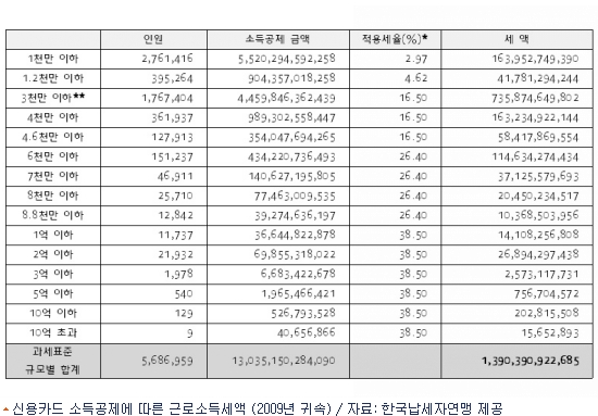 9일 국세청의 2009년 근로소득 연말정산 신고현황에 따르면 전체 직장인 천 425만 112명 가운데 신용카드 등 소득공제에 의한 세금삭감 혜택을 본 직장인은 568만 6천 959명으로 39.9%에 달했다.