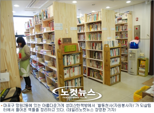 "지금 책이 들어와서 제일 바쁜 시간인데 어쩌죠. 매주 월,수,금요일이면 되살림터를 통해 1000권 정도의 책이 들어와요." "저쪽 성미산마을서재에 있는 것 빼고는 다 파는 책들이에요."
