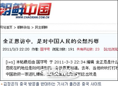 대북 단파 라디오 방송인 ''자유북한방송''은 4일 중국의 ''조선중국'' 사이트에 "김정일의 후계자 김정은이 중국을 방문하는 것은 중국인민을 모욕하는 것''''이라는 내용이 머리기사로 올라오면서 많은 네티즌들이 김정은의 중국방문 반대에 동참하고 있다"고 전했다. 중국 네티즌들은 ''전세계가 김정은이 현재 직위를 어떻게 얻었는지 알고 있다'' ''모든 것이 김정일 연출로 진행되는 서커스다''''중국 정부는 김정은 같은 인간이 중국을 방문하는 것에 대해 다시 한 번 고려해야 한다'' ''중국은 정부의 것이 아니고 인민의 것이다'' 라는 내용 등이 올라 있다고 말했다.