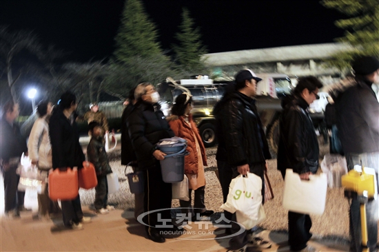 일본 도호쿠(東北) 지역에서 발생한 사상 최악의 강진과 쓰나미로 열도가 아비규환에 휩싸인 가운데 13일 저녁 물 공급이 중단된 후쿠시마현 고리야마시 주민들이 종합운동장 내 야구장에 마련된 대피소에서 식수를 받으려고 줄 지어 대기하고 있다.