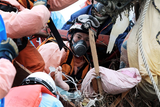 일본 전역을 강타한 140년 만의 강진과 쓰나미로 열도가 충격에 휩싸인 가운데 지진 발생 닷새째인 15일 최대 피해지역인 미야기 현 미나미산리쿠초에서 구조대가 희생자의 시신을 수습하고 있다.