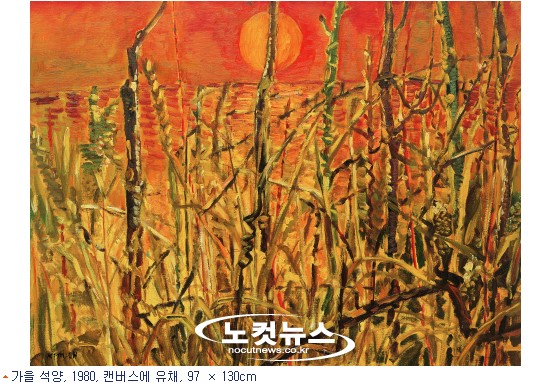 <가을 석양>(1980, 바로 위 작품)은 갈색톤의 스산한 가을풍경을 담은 것으로, 작가의 내면을 반영하는 듯하다.이 작품을 그린 시점은 그는 가정과 화단을 뒤로하고 설악에 들어선지 바로 이듬해였다. 김종학 작가는 "처음 설악에 들어갔을 때 죽고싶을 만틈 쓸쓸했다. 야생화를 보면 괴로운 내 마음을 위로해주는 것 같아 꽃그림을 그리기 시작했다"고 한다. 김 작가 본인도 추상화로 출발했고,추상화가 유행이던 그 당시에 그는 화단으로부터 ''이발소 그림을 그린다''는 비난을 들었다. 하지만 그는 "남이 어떻게 생각하든 꽃 그림에 전념했다. 봄,여름,가을, 겨울을 설악에서 나며 꽃을 그렸고,그 당시 심경이 꽃을 그리지 않으면 못배길 정도였다"고 회고했다. 왜 그랬을까? 꽃의 세계로,작업의 세계로 몰두해야만 자신의 괴로움을 이겨낼 수 있었던 것일까.