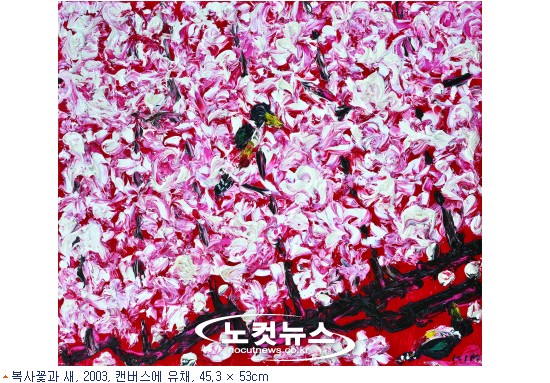 후기작에 들어서는 선이나 구도가 간결해짐을 느낄 수 있다.''개나리와 달''(2006), ''물총새와 냇가''(2006)''그믐달과 복사꽃''(2008), ''설악산''(2006)은 동양수묵화의 정갈한 운치가 느껴진다.''복사꽃과 새''(2003, 바로 아래 그림)은 추상화 느낌이 나는데, 폭발하는 듯한 붓터치는 주체할 수 없는 환희를 잘 표현하고 있다.
