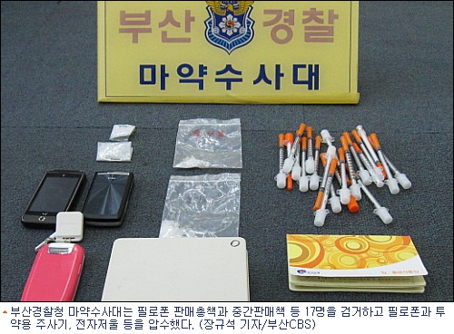 부산경찰청 마약수사대는 13일 필로폰 50g을 부산경남 지역에 유통시킨 혐의로 판매 총책 최모(38) 씨와 중간 판매책이자 연산동 일대 조직폭력배인 김모(36) 씨 등 12명을 구속하고, 5명을 불구속 입건했다.