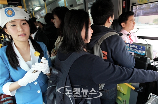 서울시 대중교통 이용의 날(매달 넷째주 수요일)인 20일 오전 강북구 우이동을 출발해 명동 롯데백화점으로 향하는 151번 버스에서 ''추억의 버스 안내양'' 이벤트가 진행되고 있다.
