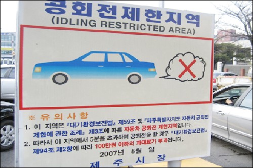 이에 따라 제주시는 관공서를 비롯해 대형유통매장 주차장과 체육시설 등 55곳을 자동차 공회전 제한지역으로 지정, 공회전 금지를 알리는 표지판을 설치했다.