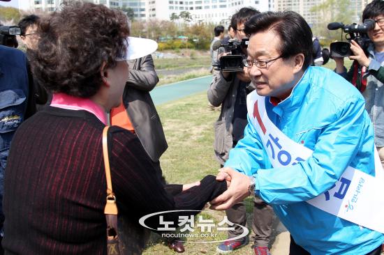 4.27 재보궐선거 분당을 지역에 출마한 한나라당 강재섭 후보가 25일 오전 분당 탄천에서 기자회견을 가진 뒤 유권자들과 인사를 하고 있다.