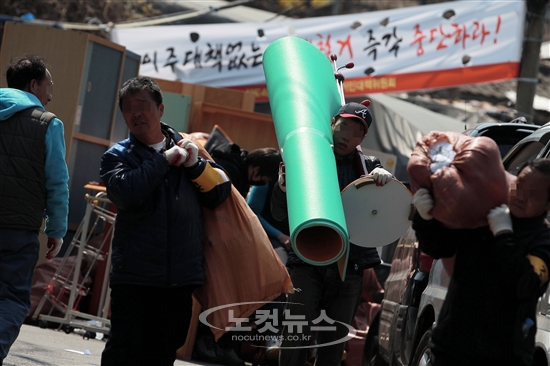 25일 서울 상도 4동 산 65번지 재개발구역에서 강제철거가 진행된 가운데 용역업체 직원들이 집기를 옮기고 있다. 서울에서 얼마 남지 않은 달동네인 이곳은 지난 2007년 재개발구역 지정 후 마을의 70%가 철거됐고 현재 주민 40여명이 살아가고 있다.