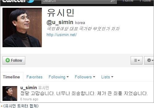 유시민 대표는 28일 새벽 트위터에 "정말 고맙습니다. 너무나 죄송합니다. 제가 큰 죄를 지었습니다"라는 짤막한 글을 올렸다.