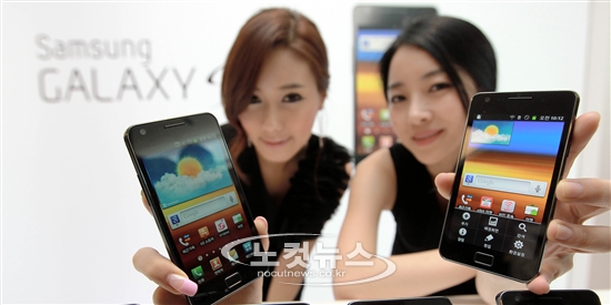 삼성전자가 28일 오전 서울 강남 삼성전자 서초사옥에서 갤럭시S2(GALAXY S2) 런칭 인 서울 행사을 연 가운데 모델들이 신제품을 들어 보이고 있다.