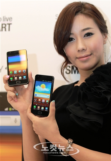 삼성전자가 28일 오전 서울 강남 삼성전자 서초사옥에서 갤럭시S2(GALAXY S2) 런칭 인 서울 행사을 연 가운데 모델들이 신제품을 들어 보이고 있다.