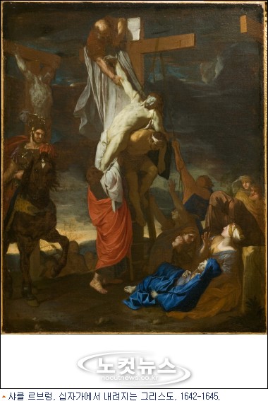 <십자가에 내려지는 그리스도>(샤를 샤브렁, 프랑스, 1642-1645년, 바로 위 작품 )는 제단화의 주제로 즐겨 그려졌다. 특히 바로크 시대 화가들은 죽은 그리스도의 잿빛 피부색과 뒤틀린 몸을 묘사하는데 있어 그 감정적인 내용을 십분 활용했다. 이 작품에서 작가가 실험한 대각선 구도와 날카로운 명암대비 효과는 로마의 영향을 보여준다. 병사와 성 요한이 걸친 붉은 옷 그리고 정신을 잃은 성모 마리아가 입은 푸른 옷은 본래 색채의 생생함과 대비효과를 짐작하게 한다.