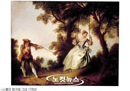 <그네>(니콜라 랑크레, 파리, 1735년경, 바로 아래 작품)는 사실주의의 판타지를 결합시킨 전형적인 로코코 양식을 띠고 있다. 젊은 남자는 1730년대 유행했던 옷을 입고 있으나 여자는 장난기 많은 양치기 소녀의 복장을 하고 있어 재미삼아 전원생활을 흉내내던 귀족들의 오랜 전통을 상기시킨다. 이 경쾌한 분위기의 장르화는 루이 15세의 궁정을 특정지은 근심없는 즐거운 삶의 모습을 담고 있다.이 작품은 페크 갈랑트(우아한 연회)라고 불린 종류의 그림에 속한다. 페트 갈랑트는 잘 차려임은 사람들이 이상화된 시골축제나 전원적인 여흥을 즐기는 모습을 그린 상상화로 보통 에로틱한 함의를 지녔다.