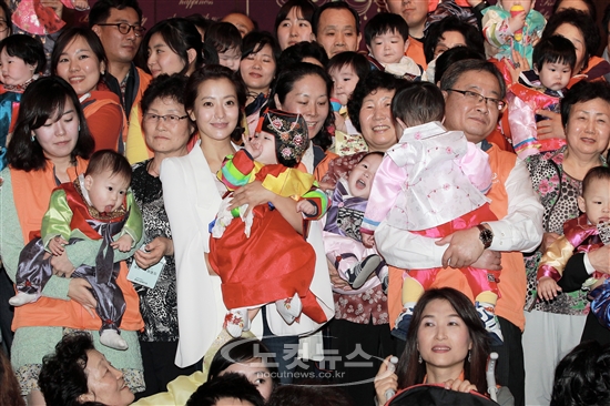 3일 서울 여의도 63빌딩 그랜드볼룸에서 열린 ''입양 전 아동 돌잔치''에서 해외 입양을 김창범 한화 L&C 대표이사와 전속모델 김희선이 첫 생일을 맞은 어린이들과 기념촬영을 하고 있다.
