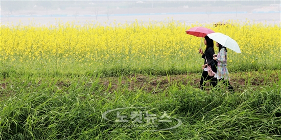 ''2011 한강 서래섬 유채꽃 축제''가 시작된 10일 서울 반포 한강공원 서래섬에서 시민들이 봄비를 맞으며 노랗게 만발한 유채꽃 길을 걷고 있다. 서래섬 유채꽃 축제는 다양한 시민참여 프로그램과 함께 오는 15일까지 계속된다.