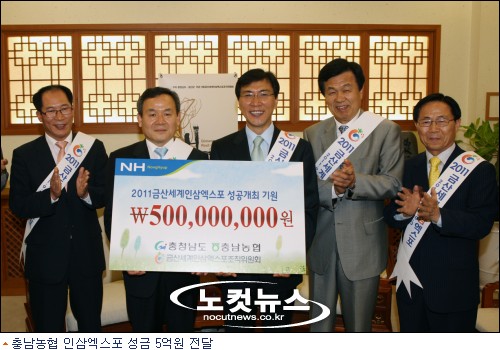 농협이 석달 여 앞으로 다가온 ''2011금산세계인삼엑스포''의 성공개최를 위해후원금 5억원을 충남도에 기탁했다.