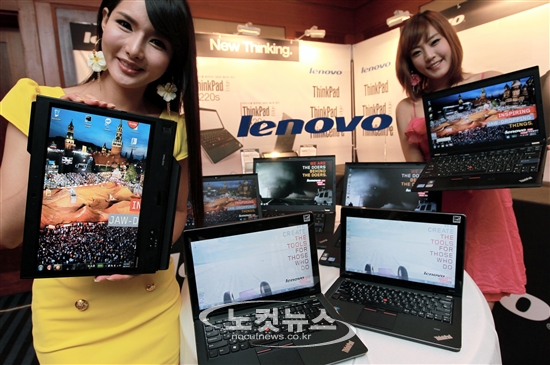 한국레노버(대표이사 박치만)가 12일 오전 서울 강남구 삼성동 그랜드 인터콘티넨탈호텔에서 노트북 브랜드 중 가장 오랜 전통을 자랑하는 씽크패드(ThinkPad) 및 씽크센터(ThinkCenter) 제품군의 최신 모델을 발표하는 기자간담회에 앞서 모델들이 신제품을 소개하고 있다.