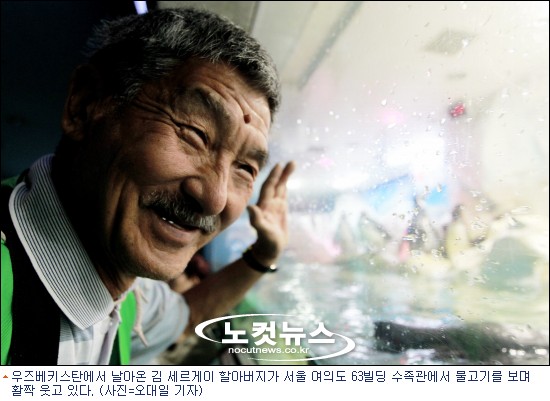 지난 주말 경복궁과 민속촌 등을 둘러본 데 이어 이날 오전 서울 강남 투어까지 마치고 온 김 할아버지는 63빌딩 수족관에 들어서자 그곳을 찾은 유치원 아이들마냥 신기하다는 눈으로 물고기를 관찰했다. "우즈베키스탄에는 바다가 인접해있지 않아 물고기 구경하기가 쉽지 않다"고 한 인솔자가 귀띔했다.