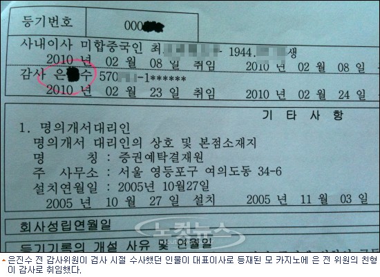 은진수 전 감사원 감사위원의 ''친형''이 감사로 등재된 ''카지노''가 공교롭게도 은 전 위원이 ''모래시계'' 검사시절 조사했던 슬롯머신 업계 대부 정덕진씨의 동생이 경영했던 곳으로 CBS 취재결과 확인됐다.