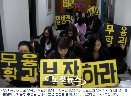 {IMG:3}부산 동아대학교가 학령인구 감소에 대비해 2012년부터 무용학과를 폐과하기로 하자 이 학과 학생들이 총장실 앞에서 철야농성에 돌입했다.
