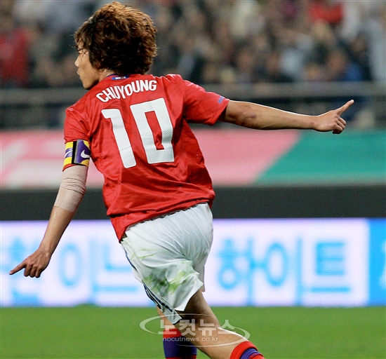 축구대표팀의 스트라이커 박주영(모나코)이 3일 저녁 서울 상암동 서울월드컵경기장에서 열린 2014 브라질 월드컵 3차예선 대비 세르비아와의 평가전에서 전반 10분 선제 헤딩골을 성공시킨 뒤 환호하고 있다.