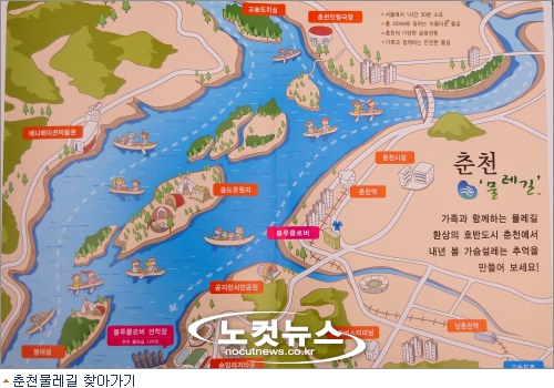 춘천물레길은 카누로 의암호 일대를 돌아보는 체험관광상품으로 송암스포츠타운에서 붕어섬, 중도유원지를 돌아오는 8km 구간에 조성됐다.