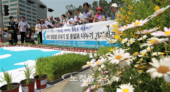 한반도 평화 실현을 위한 통일쌀 보내기 국민운동본부가 14일 오전 서울광장에서 ''평화를 나누자, 통일을 키우자! 2011 통일쌀 모내기 및 통일모 나누기'' 기자회견을 갖고 있다.