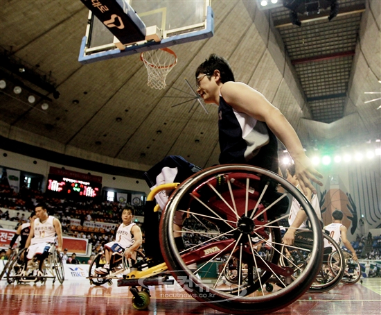 17일 오후 잠실학생체육관에서 막을 올린 제10회 우정사업본부장배 전국휠체어농구대회 고양시홀트 대 무궁화전자의 경기에서 양팀 선수들이 휠체어를 힘껏 움직이고 있다. 장애인들에게 재활의 희망과 용기를 심어주고 장애인과 비장애인이 함께 소통하는 화합의 장을 목표로 열린 이번 대회에는 15개의 장애인팀과 6개의 비장애인팀, 3개의 여성휠체어농구팀 등 총 24개 팀이 참가해 나흘간 열전을 벌인다.