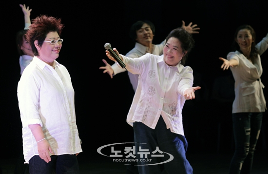 23일 오후 서울 서대문구 신촌동 연세대학교 백주년기념관에서 열린 양희은 데뷔 40주년 기념 뮤지컬 ''어디만큼 왔니''(극본 박금선·연출 이종일) 제작발표회에서 양희은, 양희경 자매를 비롯한 배우들이 공연의 일부분을 선보이고 있다.