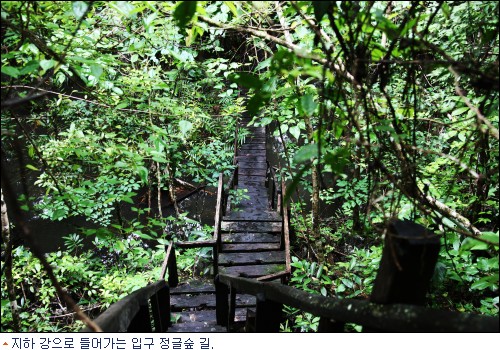 지하 강으로 들어가는 입구 정글 숲길 주변에는 원숭이와 악어가 사람들을 맞이한다. 이 일대는 다양한 생물종의 서식지여서 1971년 국립공원으로 지정됐다.