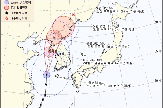 기상청은 26일 오전 7시 발표된 태풍 예보에서 5호 태풍 메아리가 제주 서쪽 해상을 지나 서해를 따라 북상하면서 26일 18씨 쯤 백령도 남남동쪽 40km 해상을 지나 황해도에 상륙한 뒤 평양 북쪽과 27일 오후 6시 청진 서쪽 140km부근을 거치는 노선으로 북한을 관통해 지날 것으로 예보했다.