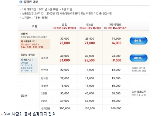 2012여수세계박람회의 입장권 예매가 시작돼 사전 구매시 최대 15%까지 저렴하게 구매할 수 있다.