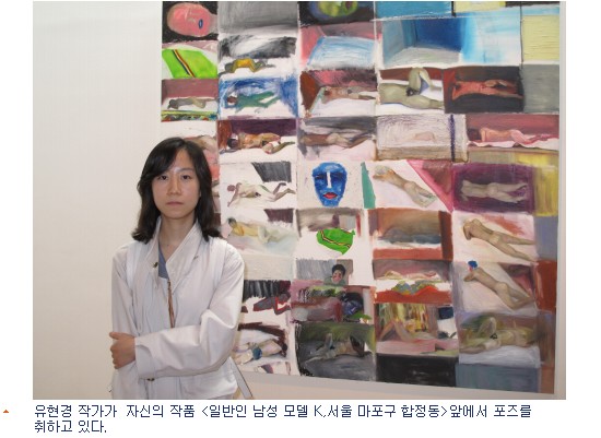 20대 중반의 유현경 작가(26세)는 남성의 벗은 몸에 대한 세밀한 관찰을 통해,인간보편의 심리와 포즈를 묘사했다. 그의 작품 <일반인 남성 모델 k,서울 마포구 합정동>(위 작품)은 전문 모델이 아닌, 일반인 남성을 모델로 삼아 함께 여행을 다니며 그린 것이다. 여성화가가 그린 남성신체에서 관능보다는 내면의 다양한 감정이 드러나는 이유는 어디에 있을까? "시간이 지나면서 결국은 남자를 그렸다기 보다는 사람을 그렸다는 것에 더 접근을 하게 되거든요. 이런 포즈들이 나오게 된 데는 작가 개인의 서정성이나, 사람이 어떤 공간에 놓여 있을 때 몸의 포즈를 통한 그 사람의 마음, 이런 것들에 제 감정을 많이 투입하게 된 것 같아요. 실제로 제 작품을 보는 다른 사람들이 자화상으로 볼 수 있는 여지가 있지 않느냐고 했을때 전혀 틀린말이 아니라고 생각되었거든요. 왜냐하면 사람이 취하고 있는 포즈를 통해 저의 정서를 드러내고 있기 때문이죠." 이 작품은 벗은 남성의 쓸쓸한 내면을 다루고 있지만, 불편하거나 쳐진 느낌을 주지 않다. 그 이유를 작가는 이렇게 답한다. "저 역시도 너무 무겁거나 직설적으로 표현하기보다는 비유적이거나 긍정적 부분의 이야기를 선호하기 때문에 저의 태도가 반영된 것이라 할 수 있겠죠."