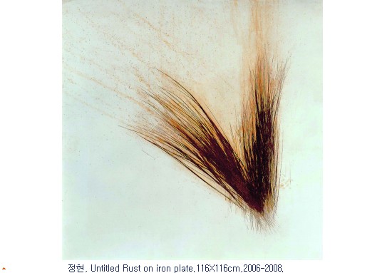 정현 작가는 철판에 생선자르는 큰칼로 잡초를 새김으로써, 난줄기 같은 유려함과 잡초의 생명력을 철판에서 피워내고 있다.