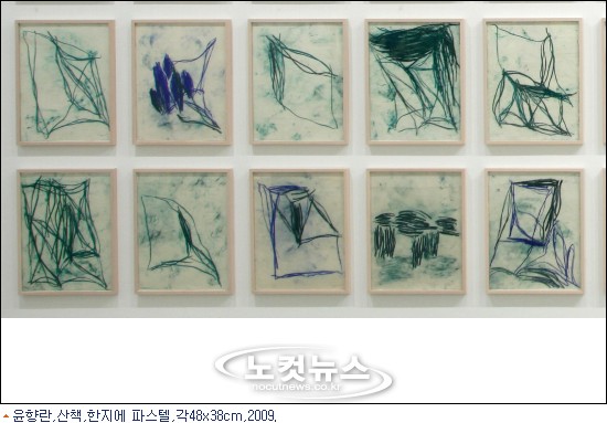 윤향란 작가의 <산책>은 드로잉 연작으로, 작가는 세세한 감정표현을 지닌 과감한 선을 자유롭게 구사해 타향 프랑스에서 느끼는 압박감과 피곤함을 지워버리려는 듯한 대담함을 보여준다.