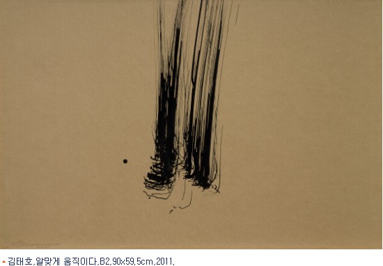 김태호 작가(서울여대)의 <알맞게 움직이다>는 가느다란 나뭇가지묶음으로 붓을 삼아 간결하고 힘찬 먹선을 표현함으로써 한 획의 강렬한 힘을 보여주고 있다.