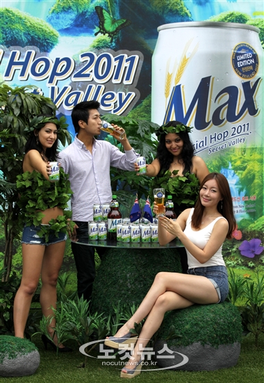 하이트맥주(사장 김인규)가 4일 오전 서울 광화문 일민미술관 앞에서 가진 ''맥스 스페셜 호프 2011'' 출시기념 행사에서 모델들이 제품을 들고 포즈를 취하고 있다.