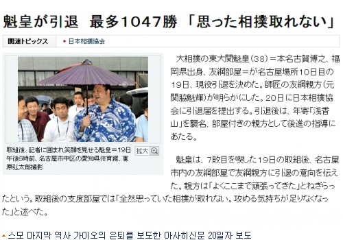아사히신문과 요미우리신문 등 일본 언론들은 20일, 23년 동안 1,047승의 최다승 기록을 세운 가이오(魁皇·38)가 은퇴를 결정했다고 보도했다.